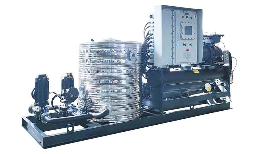 2、以乙二醇為載冷劑的撬裝式螺桿制冷機(jī)組,控溫范圍在-5度至-35度;